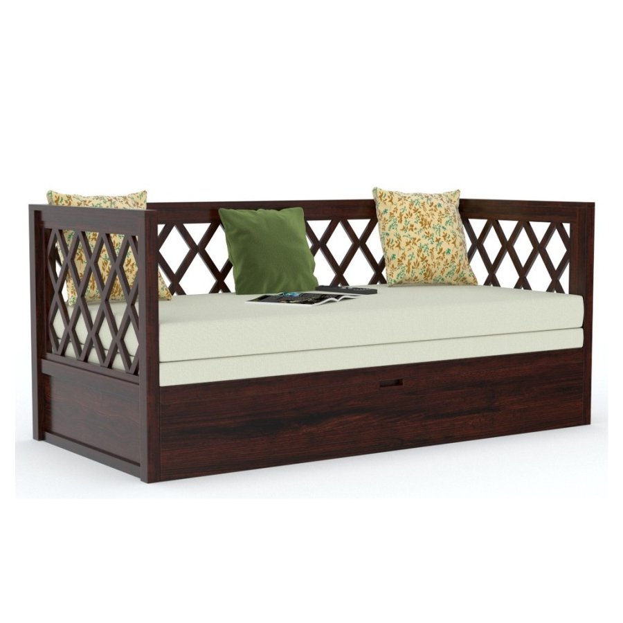 Make in India, Made of Indian Sheeshamwood. Cross Design Sofa cum bed is one of our finest design of sofa cum bed with storage. It has pullout trolley with top opening storage. This piece is beautifully polished walnut tone which gives elegant feel to it. This is perfect piece for those who has less space in their living room,because this is an compact space saving 3Str along with double bed facility. So just pullout trolley and unfold cushion to make it double bed.