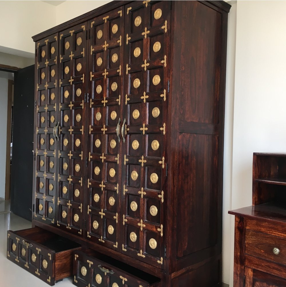 - Sheesham wood wardrobe with 4 doors and drawers at the bottom adorned with pure brass flowers