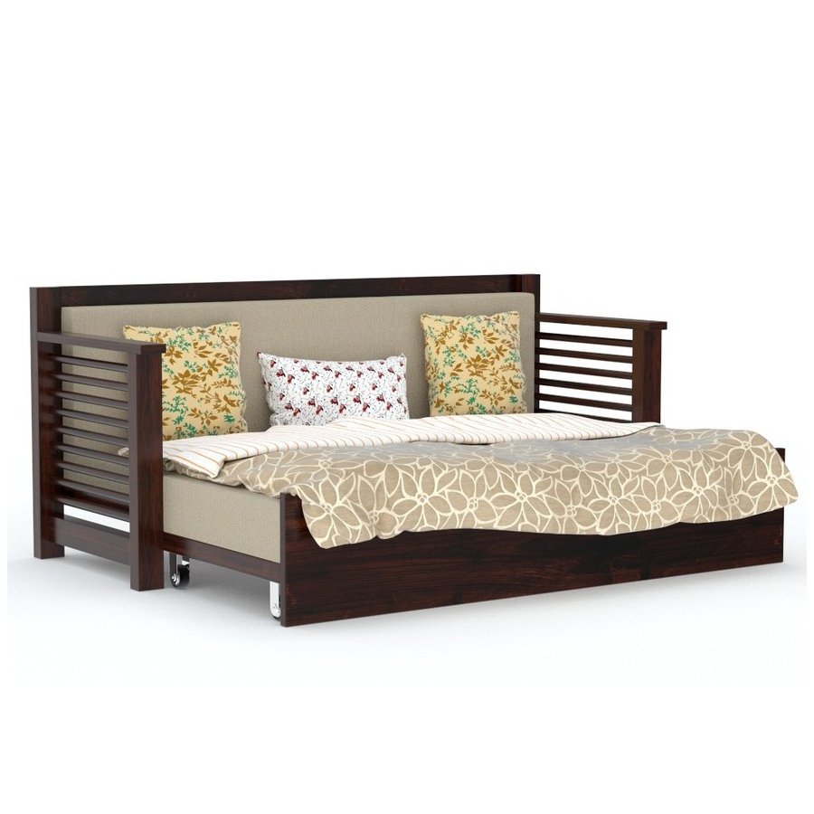 Make In India, Made for India. Strip Sofa cum bed is made of Indian sheeshamwood (Rosewood). This beautiful, strong and sturdy design walnut polished. This will be double bed as you open its dawn pullout trolly.